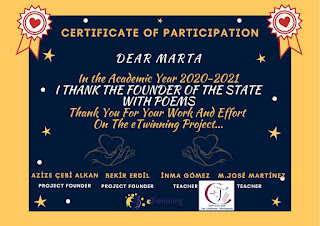 Esta mañana hemos hecho entrega de los diplomas de participación en el proyecto #eTwinning "I thank to the founder of the state with poems", en el que colaboramos los alumnos de 4º, 5º y 6º de Primaria junto con varios países.